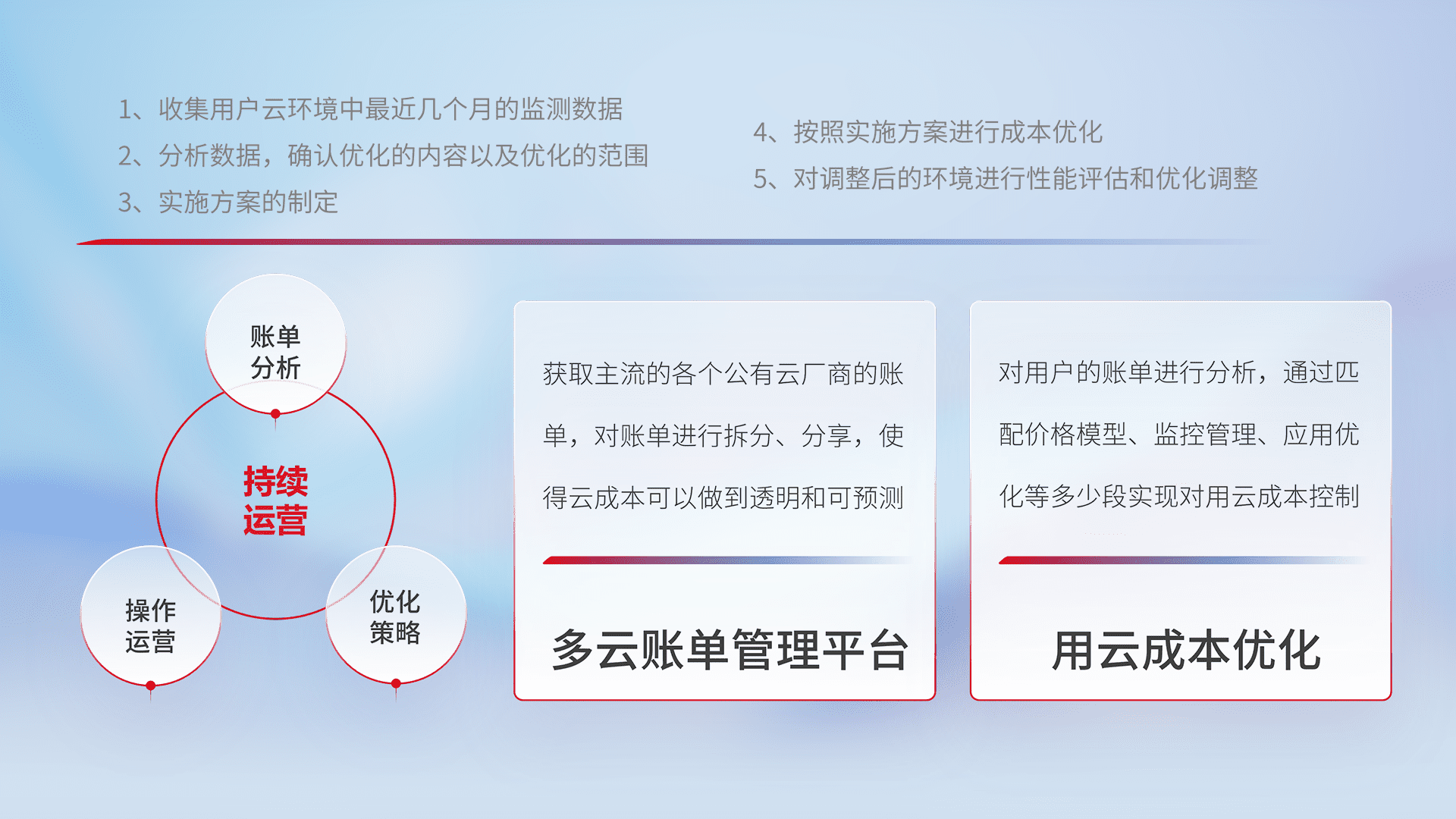 通过多云纳管,,以统一的资源数据模型把客户的云资源进行抽象和封装,,进而实现对多云资源的统一操作,,,保障云资源管理的可靠性、、、、稳定性与可用性。。。。量身定制化运维内容,,,配置、、开发运维、、补丁管理、、、、备份、、、、监控、、、认证和访问管理、、、、审计和日常巡检等,,保障在用云过程中的可靠度,,稳定度以及高可用率。。